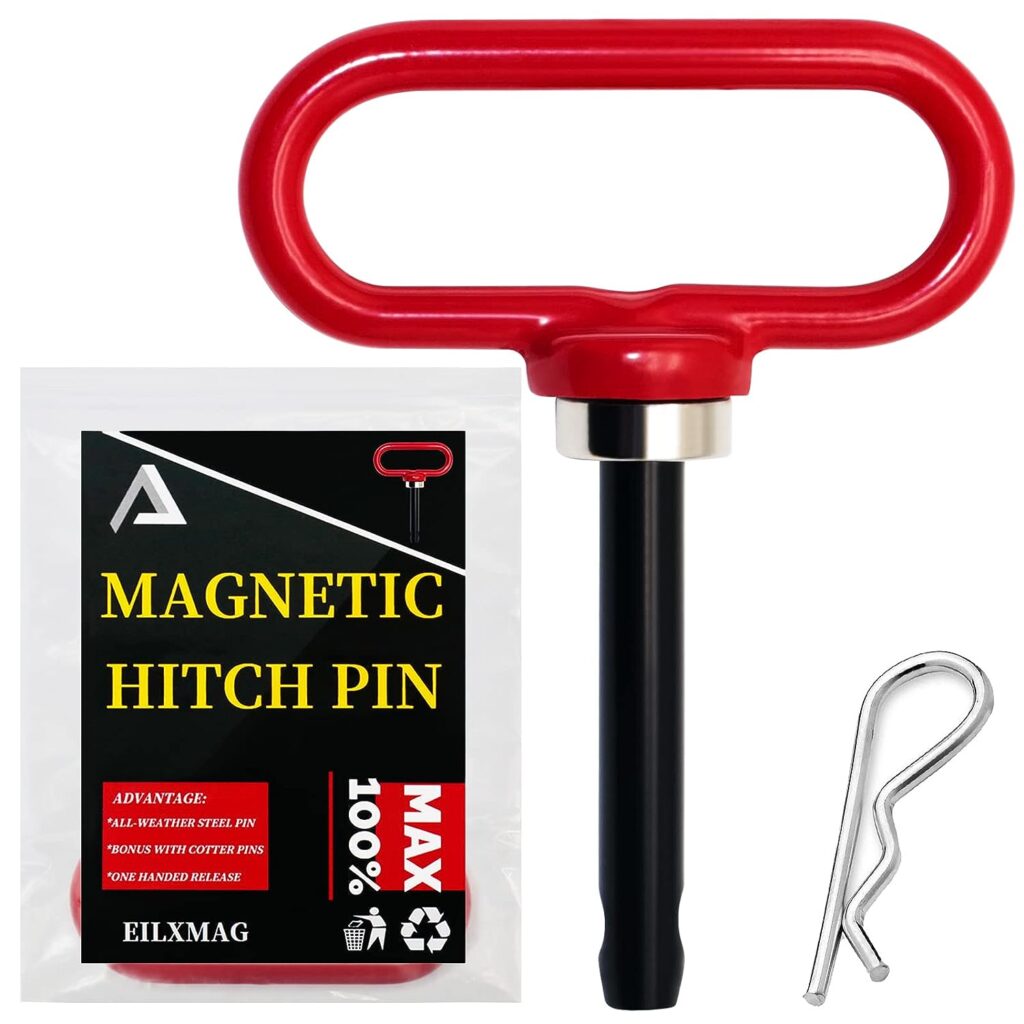 For the Polar trailer, I purchased an EilXMag magnetic hitch pin. This handy trailer attachment has a large, rubber-coated, red handle (to stand out if it falls in the pasture) and a permanent magnet to hold it in place. So you really don’t need that retaining pin except for safety’s sake.